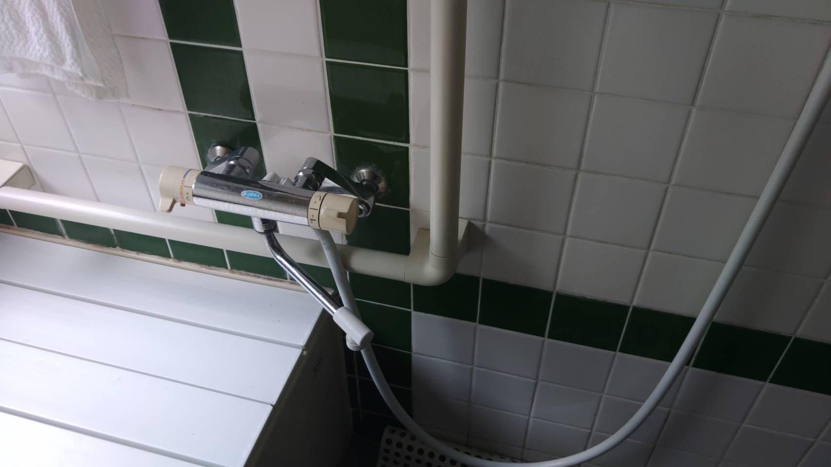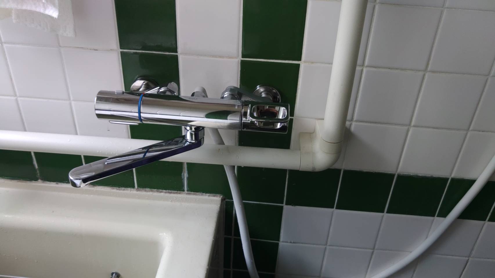 今日は、お風呂の蛇口の温度が変わらないと言う事で依頼を受けました。 15年以上使っているそうなので交換しました。 手摺が近すぎて作業ができないので外してから交換しました。 一手間増えましたが無事交換しました。