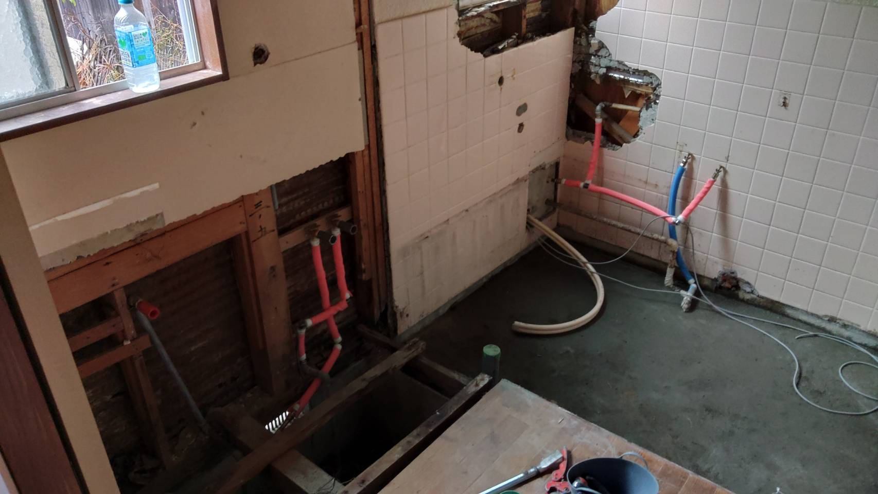 昨日の現場の続きで、ボイラーの交換と脱衣場に付ける洗面台の仕込み配管をしました。 次はお風呂屋さんにユニットバスを組んでもらえば脱衣場の床張り替えの作業に入れます。 まだ、トイレ、キッチンのリホームも有るのでなかなかボリュームがあって大変です。