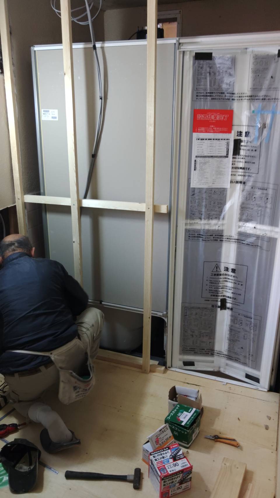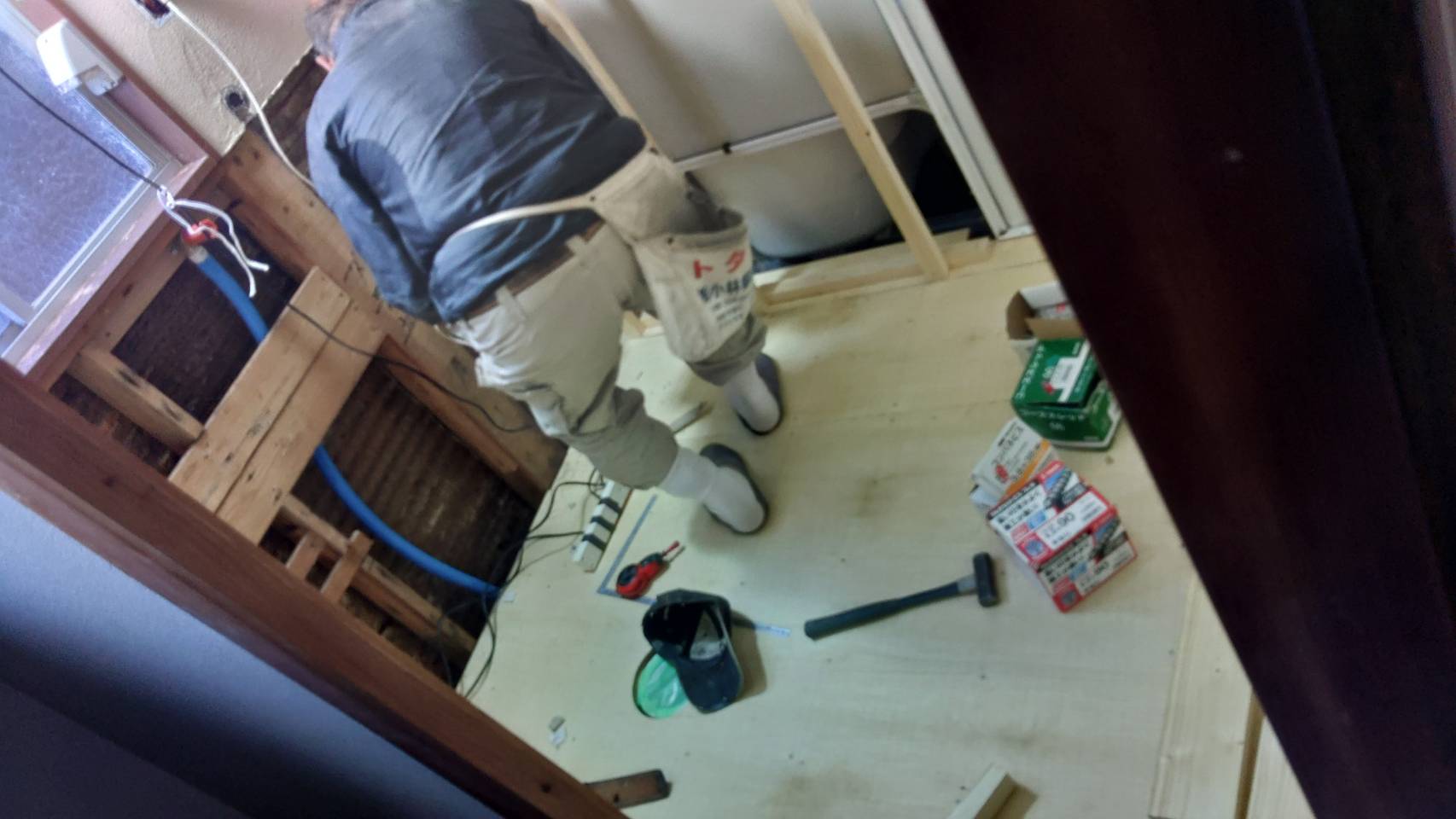 僕がやった訳ではないが、大工さんに脱衣場の床はりと壊した壁の復旧工事です。