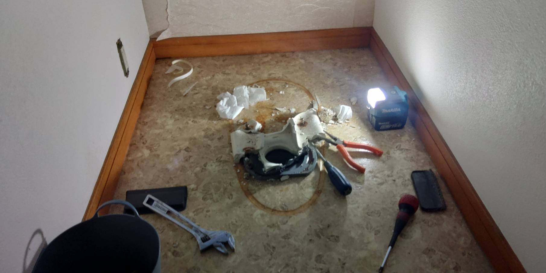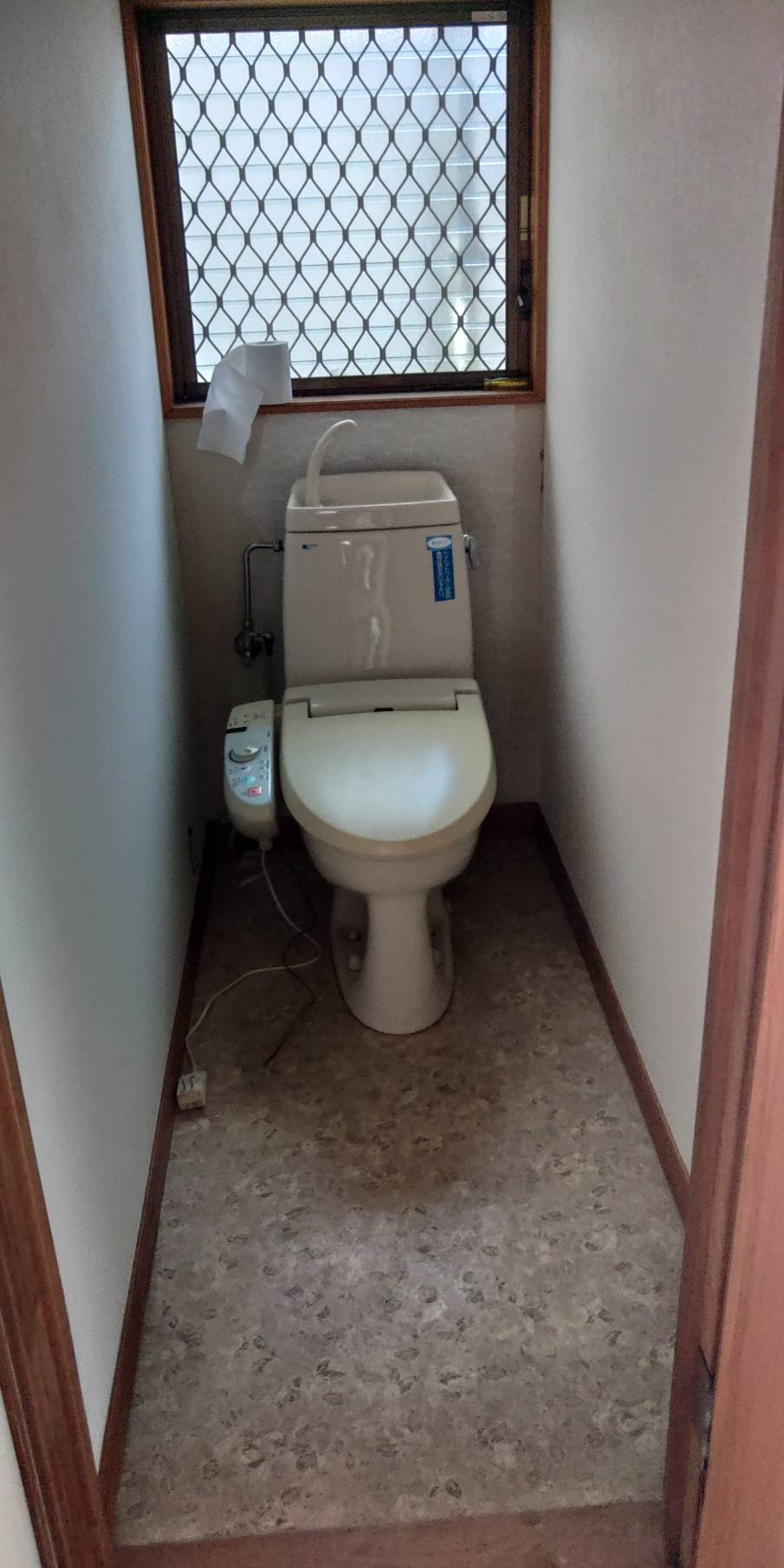 リフォームでクロスを張り替える為まずトイレを外しました。 トイレを固定しているビスがバカになってしまって空回りするので、便器を少し割って外しました。 クロス屋さんが綺麗に仕上げてくれたら取り付けです。