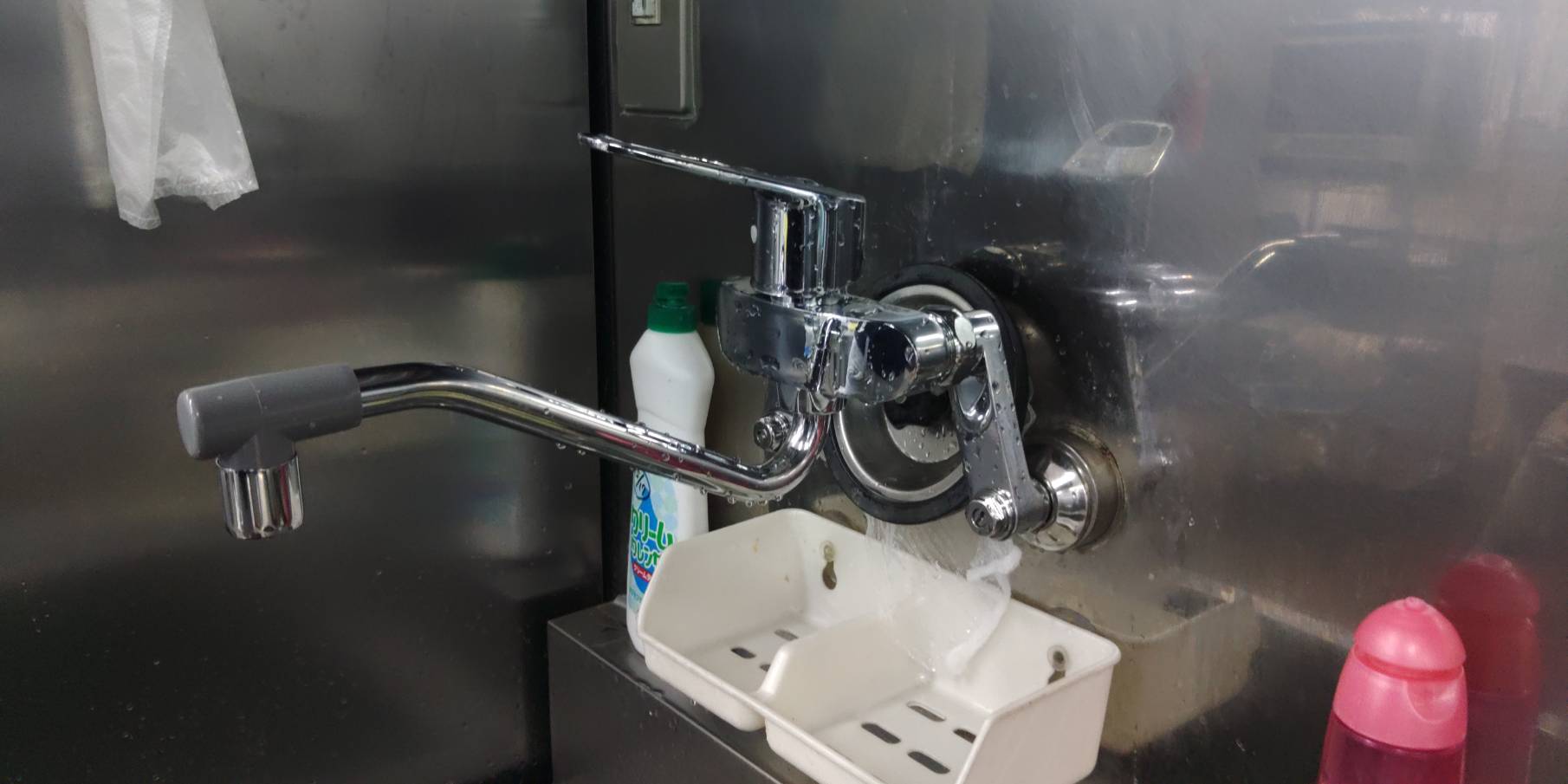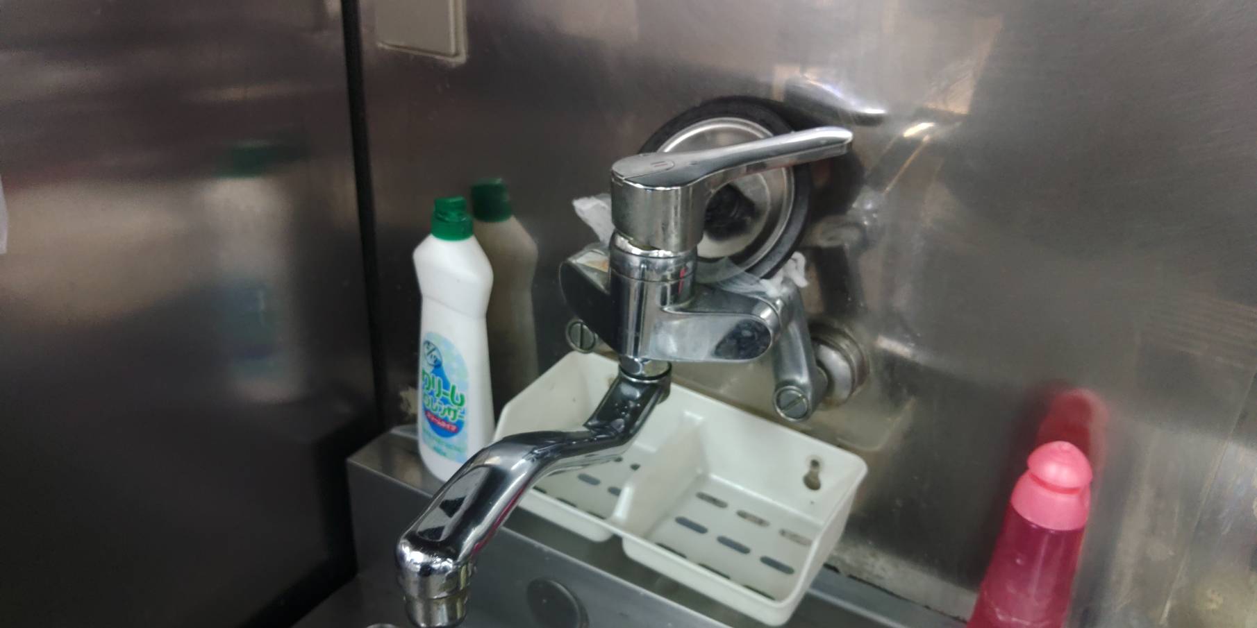 施設の厨房の混合水栓を変えました。 レバーの中が折れておかしな角度まで回ってしまうようになってしまったので交換しました。